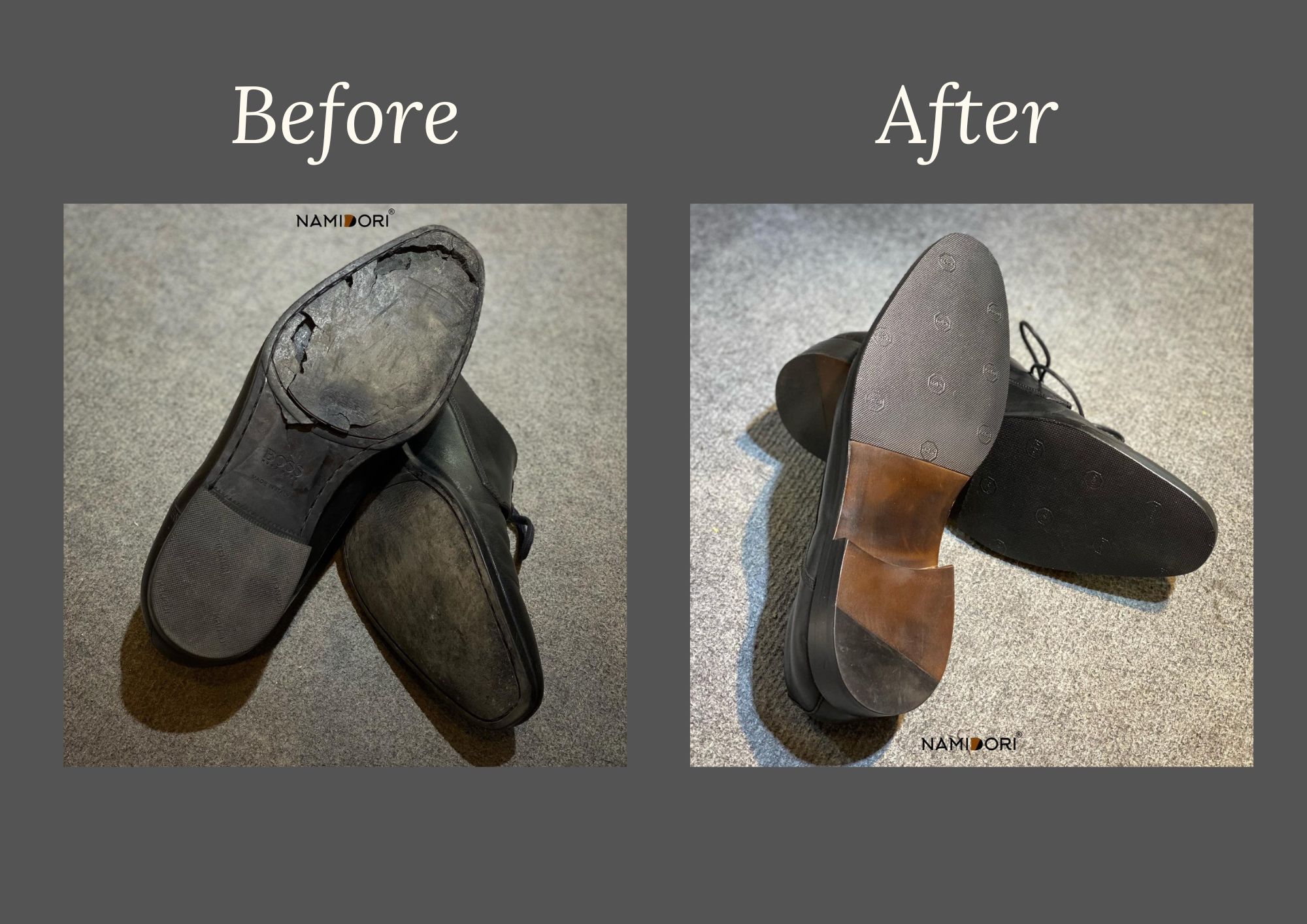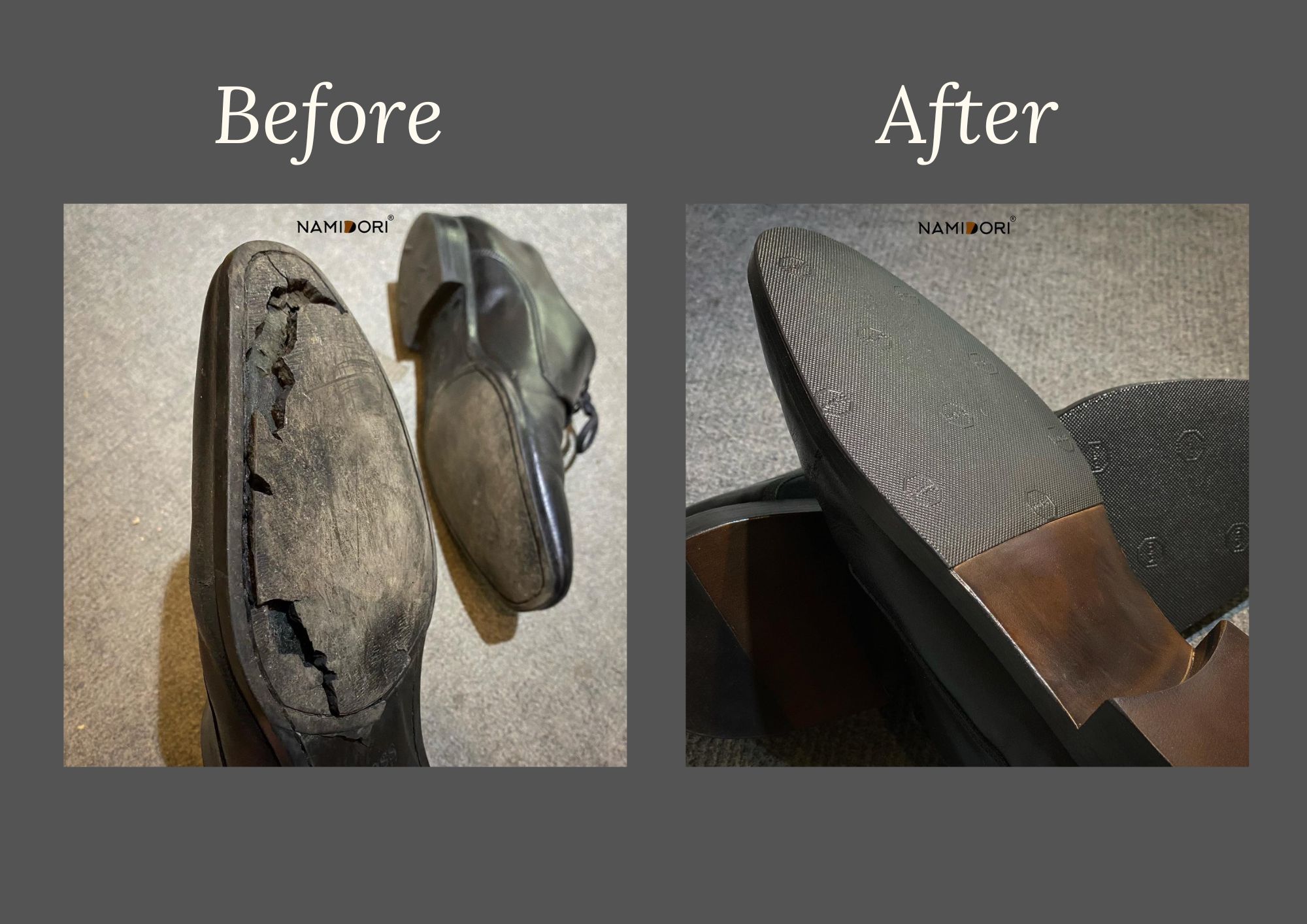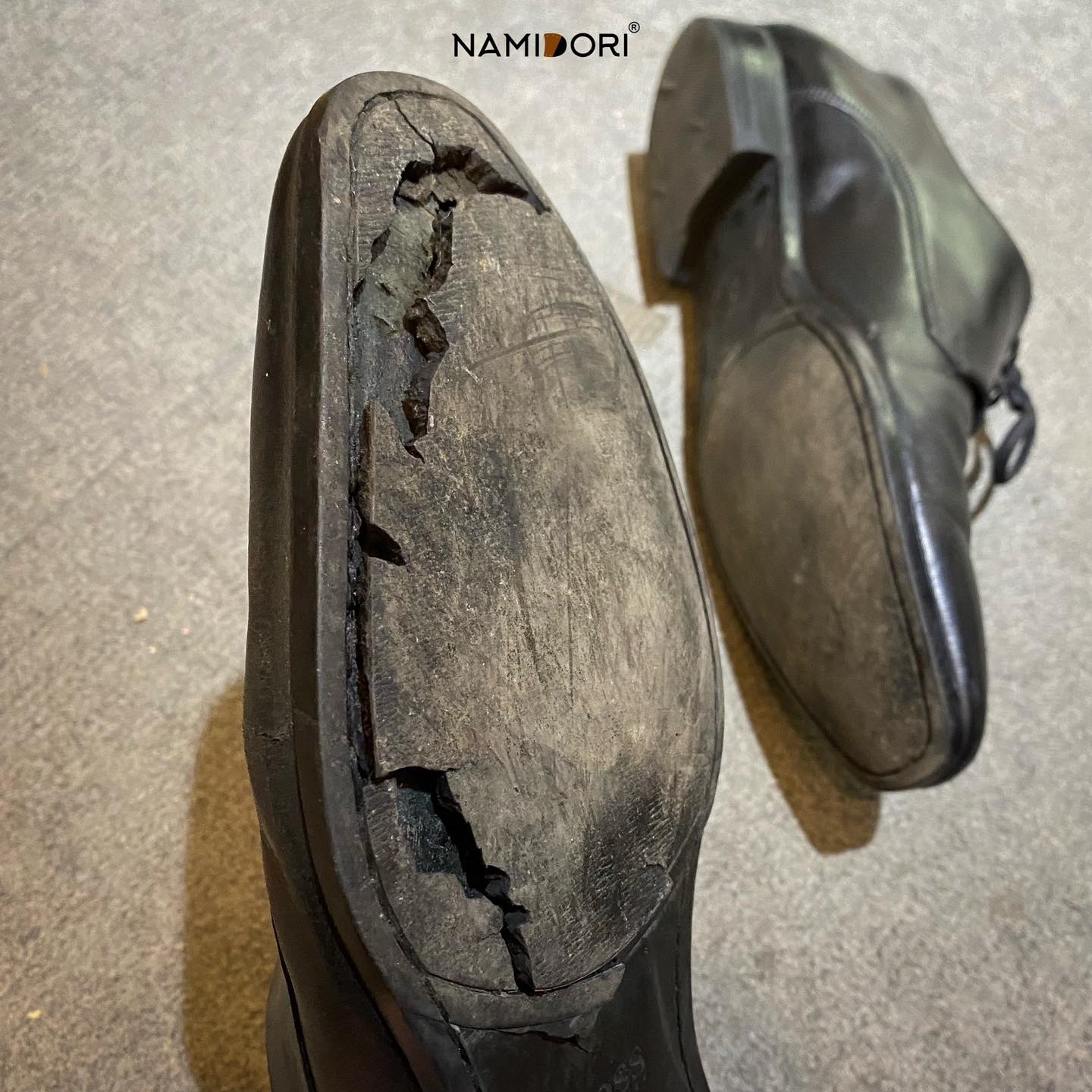 Với kinh nghiệm 10 năm trong nghề, Namidori là thương hiệu được ưa chuộng hàng đầu không chỉ ở trong nước mà còn vươn cả quốc tế. Không những tạo nên những chiếc giày thủ công chuyên nghiệp, đa dạng và sáng tạo mà dịch vụ sửa giày tại Namidori cũng được các chuyên gia đánh giá cao. Dưới đây là review trước và sau khi thay đế da và dán Non-slip đen trước tại Namidori, các bạn cùng xem kết quả ở hình dưới đây nhé.