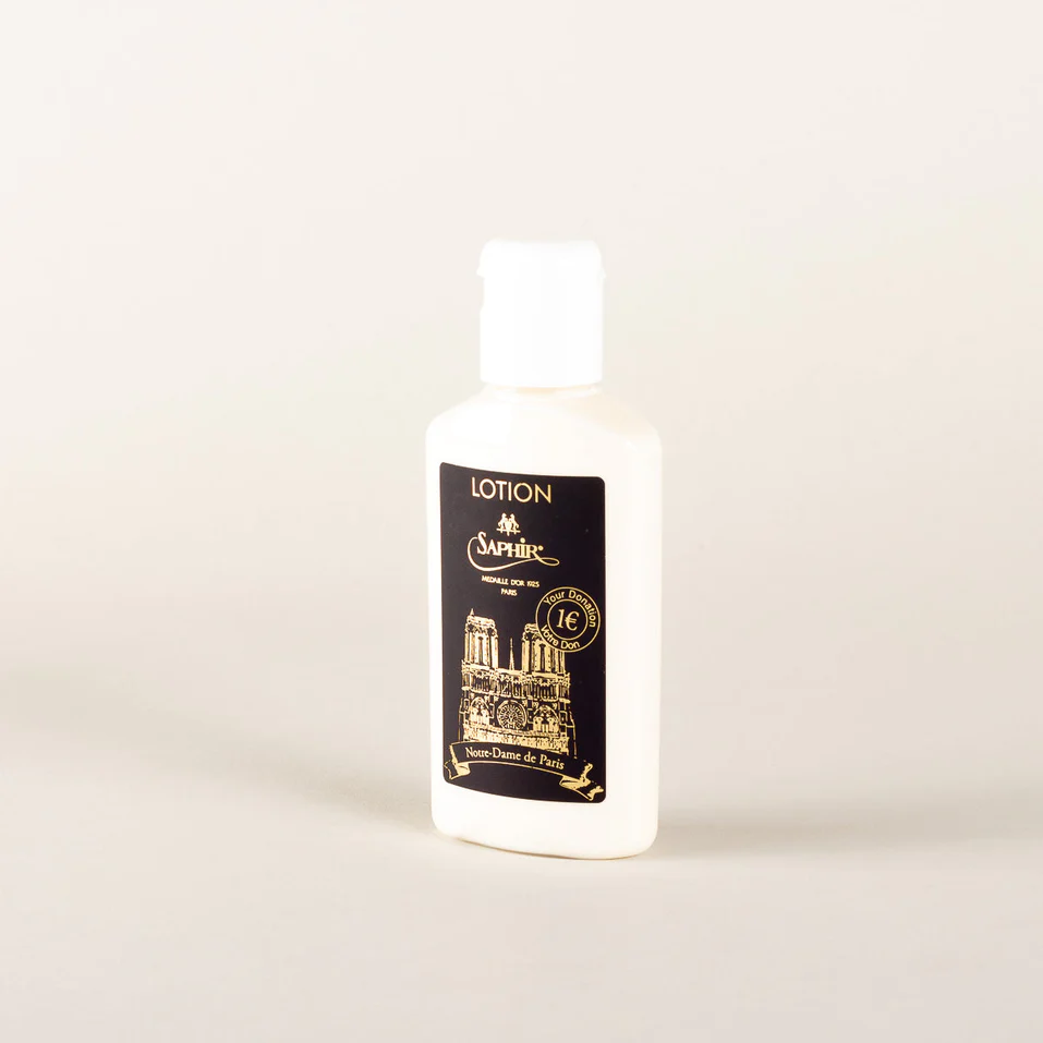 Chúng tôi khuyên bạn nên sử dụng Saphir Lotion như một bước đầu tiên trong quá trình xử lý giày da trơn của bạn, khi bạn không làm sạch sâu chúng như với Renomat. Kem dưỡng da này, bao gồm các thành phần như sáp ong và dầu chồn cực kỳ bổ dưỡng, làm sạch, nuôi dưỡng và bảo vệ tất cả các sản phẩm bằng da của bạn. Thoa bằng cách sử dụng một miếng vải cotton và để khô cho đến khi Lotion trông khô và mờ. Chải bằng bàn chải lông ngựa và đôi giày của bạn sẽ có một lớp bóng mềm. Tiếp tục điều trị bằng cách sử dụng Saphir Pommadier, Pate de Luxe và Mirror Gloss.